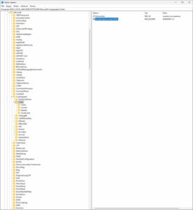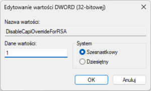 3. Po prawej stronie rejestru wyświetli się wpis „DisableCapiOverrideForRSA”, który domyślnie ma ustawioną wartość 1. Uruchamiamy edytor wpisu przez dwukrotne naciśnięcie DisableCapiOverrideForRSA.