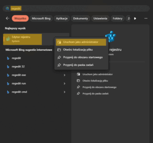 1. W menu start trzeba wyszukać program „Regedit” oraz uruchomić go jako administrator(prawy przycisk myszy otwiera menu kontekstowe z możliwością uruchomienia jako administrator).